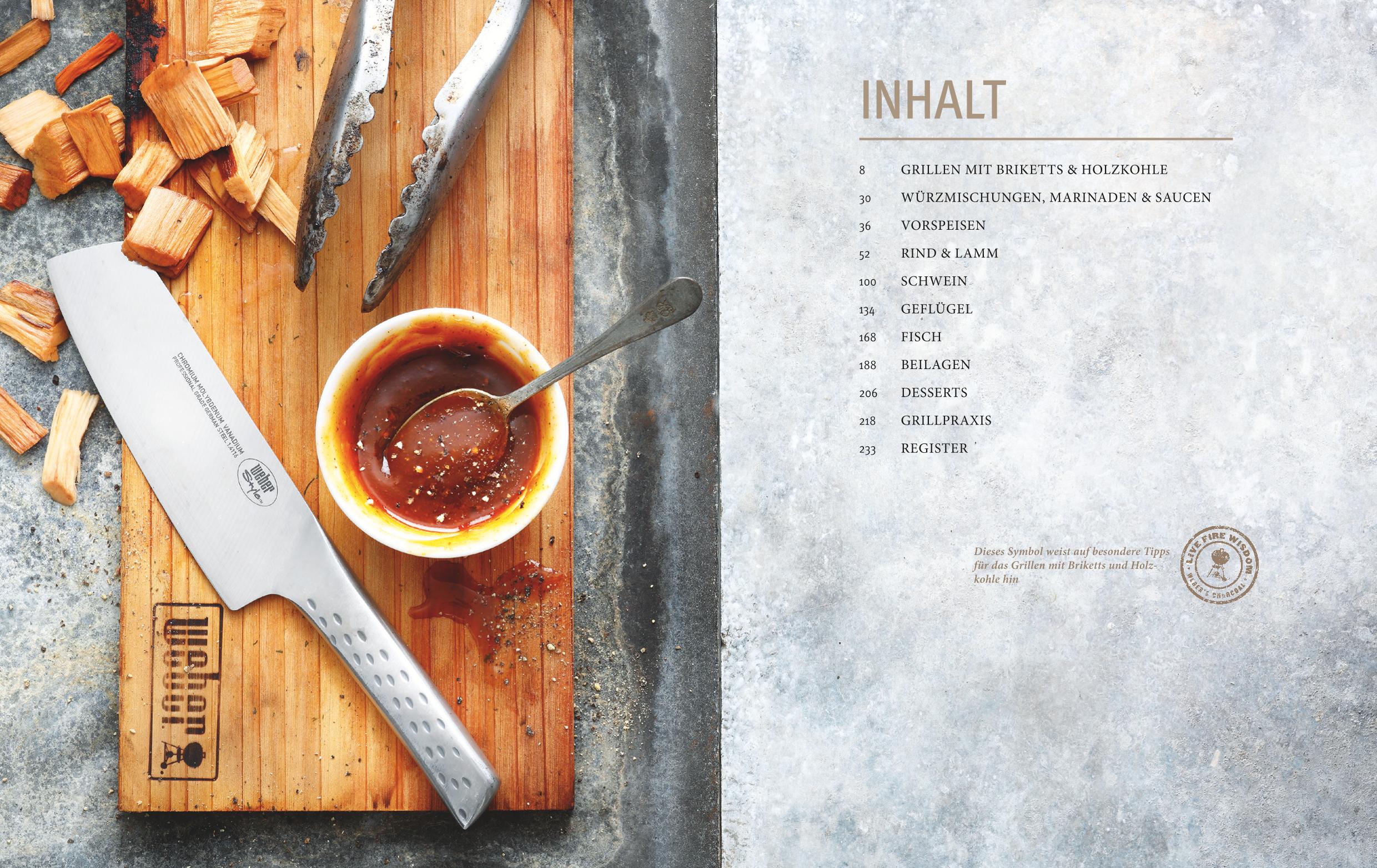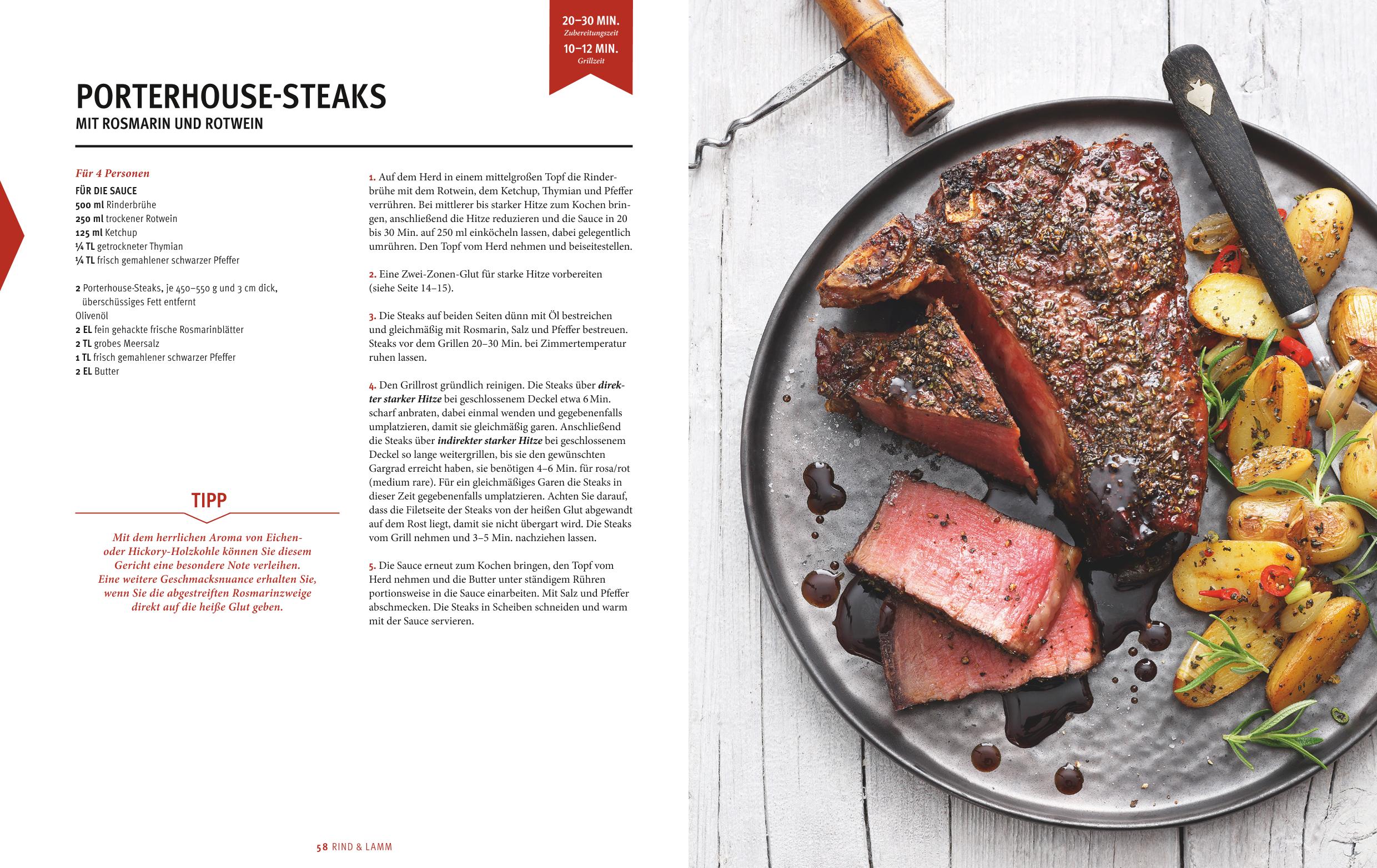 - Rind & Lamm: z. B. New York Strip Steak mit Barbecue Sauce, Porterhouse Steak mit Rosmarin und Rotwein, Würzige Rib-Eye Steak Grillspieße, Rib-Eye Steak in Kaffeekruste, Pfeffrige Steak Tortillas, Flank Steak mit Bohnensalat, Burger mit Pesto-Mayonnaise, Chili-Cheese Burger, Gegrillte Lamm-Karrees aus dem Holzrauch, Lammkoteletts mit Senfglasur …