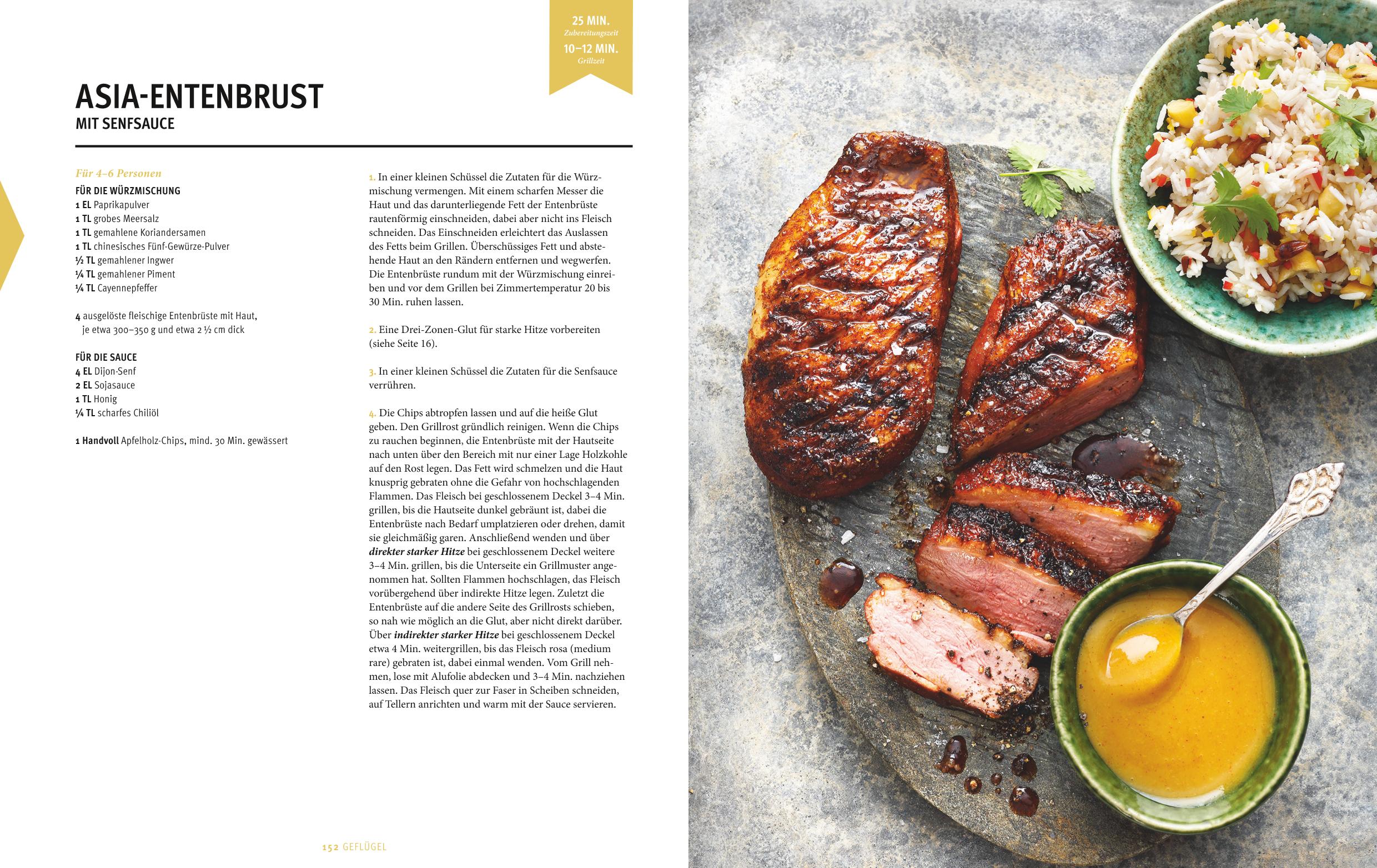 - Geflügel: z. B.Hähnchen Grillspieße mit Erdnusssauce, Hähnchen-Burritos, in Tequila marinierte Hähnchenschenkel, Andys Jerk-Chicken, Asia-Entenbrust mit Senfsauce, Johns Grillhähnchen mit Würzpaste, Barbecue Hähnchen mit Pfirsich-Chutney, Bierdosen-Hähnchen mit Knoblauch, Puten Burger mit Frühlingszwiebeln, saftiger Truthahn vom Grill …
