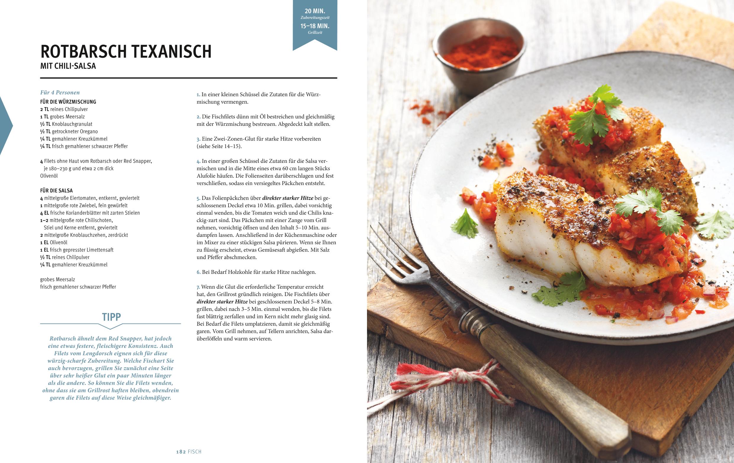 - Fisch: z. B. Lachs Rezepte (glasierter Lachs auf Zedernholz, Lachs mit Gazpacho-Salat), über Hickoryholz geräucherte Makrele, Würziger Zackenbarsch, Curry-Thunfisch Steak, Rotbarsch texanisch, Fisch-Tacos, Gegrillte Garnelen …