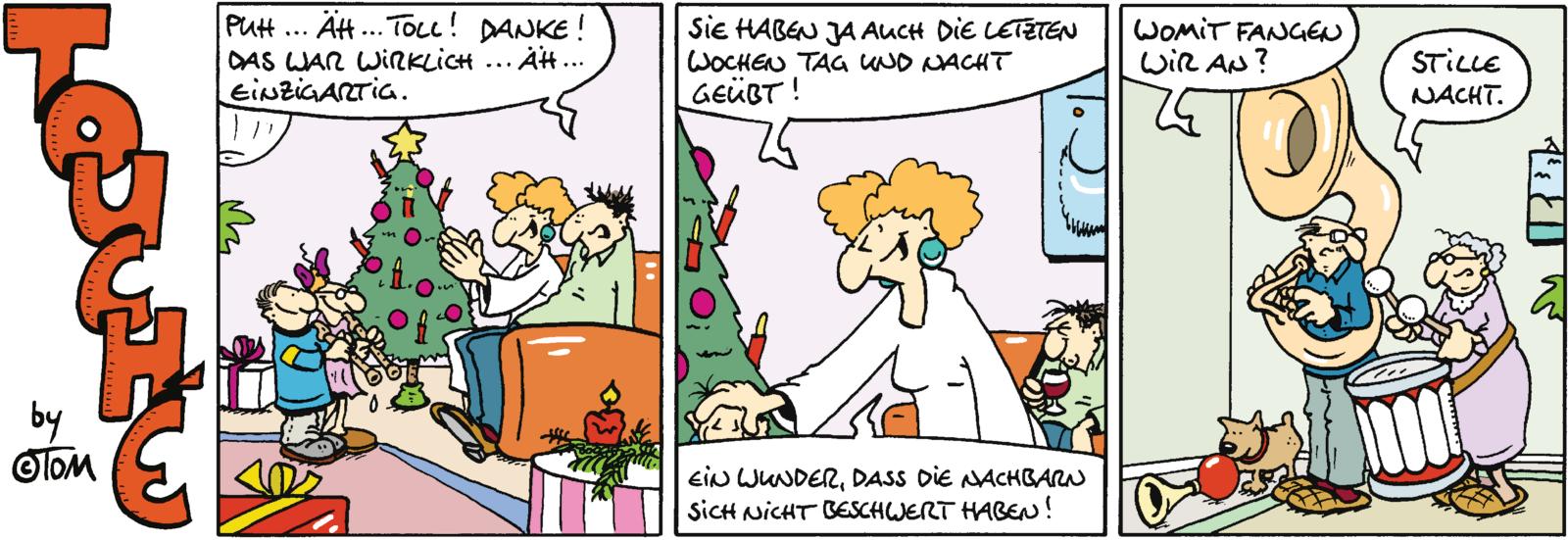 - Beschreibung Wer die Besinnlichkeit und den Kitsch an Weihnachten auch mit einem Augenzwinkern betrachtet, für den ist dieses Buch genau richtig: die lustigsten, besten und originellsten Strips, die ©Tom zum Fest der Liebe, zu Weihnachtsmännern und -frauen, zu Bastelarbeiten und Weihnachtsmusik erdacht und gezeichnet hat, sind in diesem Band versammelt. Und zwar fast vollständig in Farbe! Eine schöne Bescherung für Touché-Fans und auch für alle anderen, die es gerne fröhlich unterm Baum haben, Flötentöne hin oder her, ein wunderbares Geschenk zu Weihnachten.