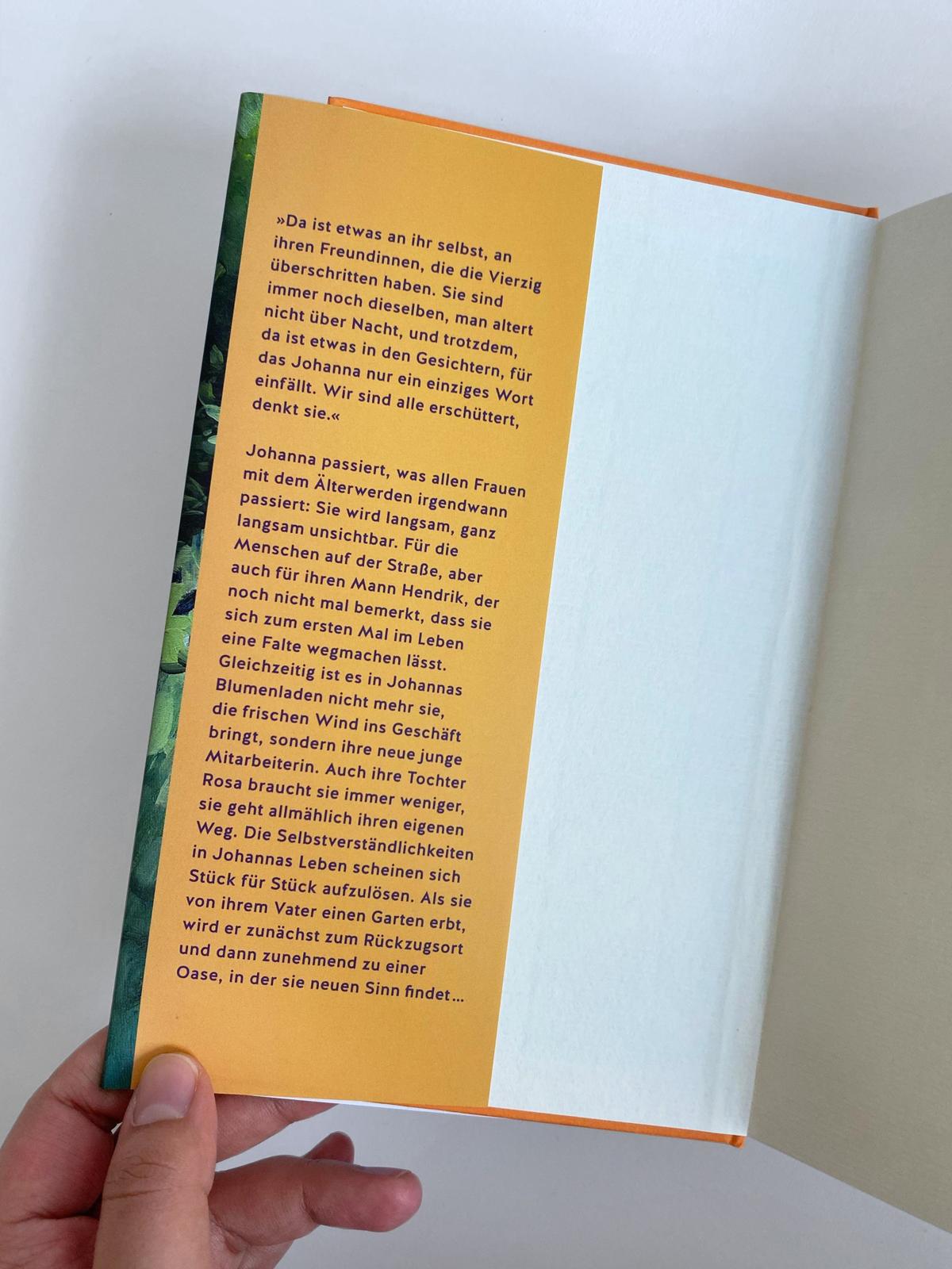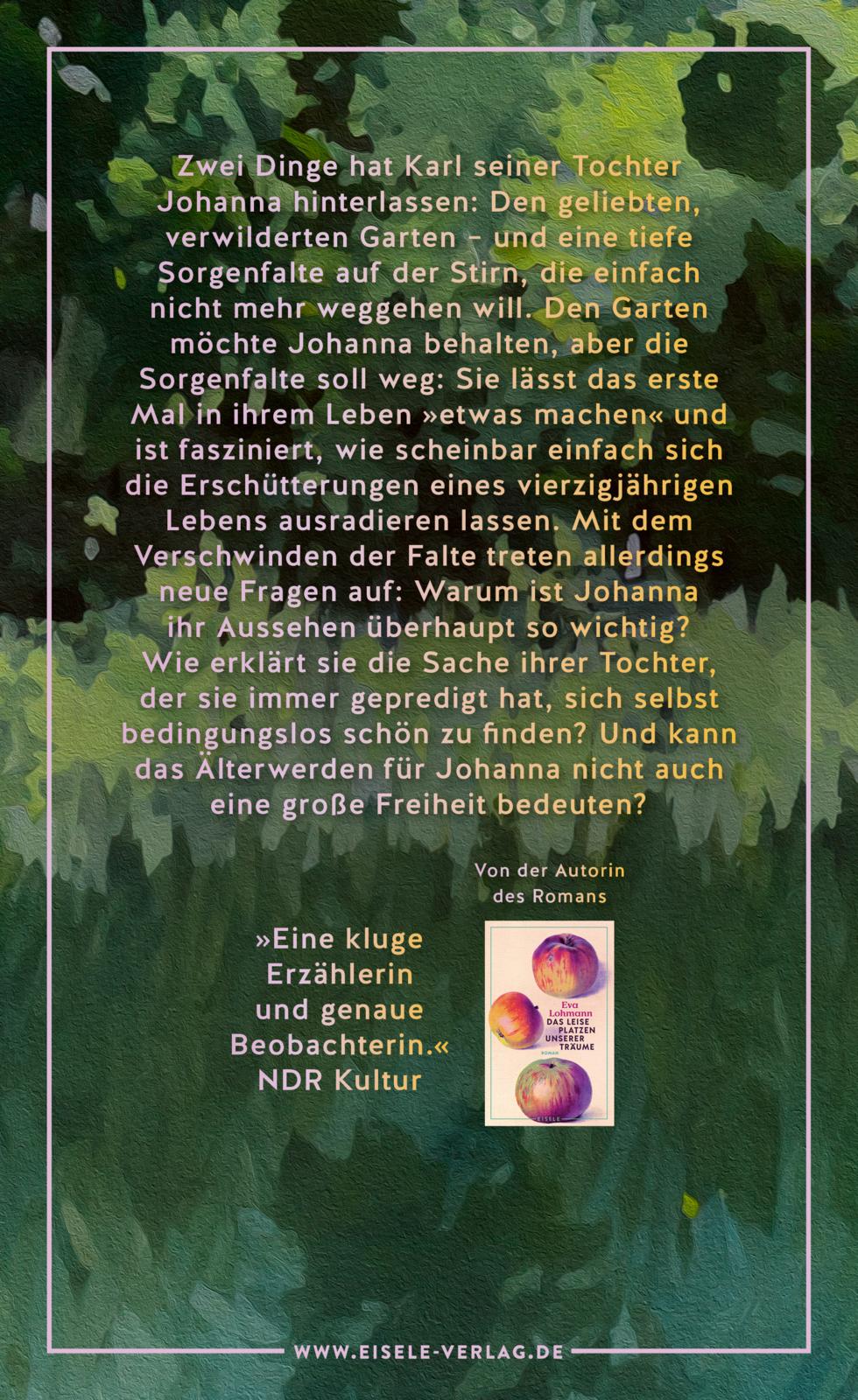 Zwei Dinge hat Karl seiner Tochter Johanna hinterlassen: Den geliebten, verwilderten Garten – und eine tiefe Sorgenfalte auf der Stirn, die einfach nicht mehr weggehen will. Den Garten möchte Johanna behalten, aber die Sorgenfalte soll weg: Sie lässt das erste Mal in ihrem Leben »etwas machen« und ist fasziniert, wie scheinbar einfach sich die Erschütterungen eines vierzigjährigen Lebens ausradieren lassen. Mit dem Verschwinden der Falte treten allerdings neue Fragen auf: Warum ist Johanna ihr Aussehen überhaupt so wichtig? Wie erklärt sie die Sache ihrer Tochter, der sie immer gepredigt hat, sich selbst bedingungslos schön zu finden? Und kann das Älterwerden für Johanna nicht auch eine große Freiheit bedeuten?