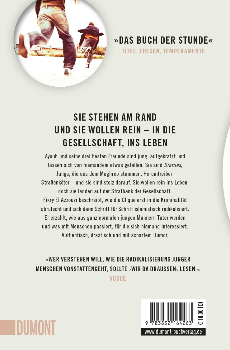 Ayoub ist zu Hause rausgeflogen, genauso wie seine besten Freunde. Zusammen mit dem hübschen, etwas schlichten Fouad und dem Halbafrikaner Maurice schlägt er seine Zeit in ihrem belgischen Heimatdorf tot und versucht, irgendwie über die Runden zu kommen. Und dann ist da noch Kevin, ein überdrehter junger Konvertit, der sich selbst in Karim umgetauft hat. Die vier wollen rein ins Leben. Sie wollen Spaß haben und Mädchen finden und eine Perspektive, aber sie bleiben isoliert, abgeschoben auf die Strafbank der Gesellschaft. Authentisch, drastisch und mit scharfem, hintergründigem Humor beschreibt El Azzouzi, wie die Clique erst in die Kriminalität abrutscht und sich dann allmählich radikalisiert. Ayoub, der weder mit Gewalt noch Islamismus etwas am Hut hat, muss miterleben, wie die Situation Schritt für Schritt eskaliert. Einen Teil der Freunde wird es noch weiter ins Aus treiben, die anderen nach Syrien in den Dschihad. ›Wir da draußen‹ erzählt, wie aus ganz normalen jungen Männern Täter werden und was mit Menschen passiert, für die sich niemand interessiert.