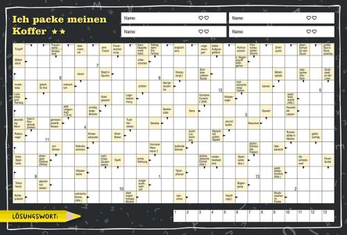 Wort für Wort zum Sieg! Bei der Kreuzwort Challenge treten alle, die Rätsel lieben, gegeneinander an – auf einem Blatt, mit Stift und Köpfchen. Wer die passenden Wörter schneller findet, trägt den Sieg davon. 100 Rätselblätter in 3 Schwierigkeitsstufen sorgen für jede Menge Abwechslung. Perfekt für schnelle Runden, einfache Regeln und maximalen Kreuzwortspaß!