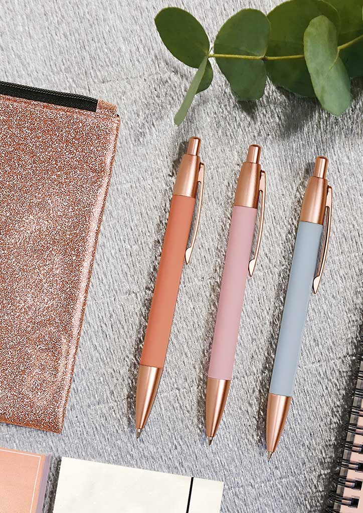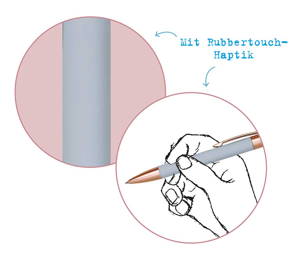 Dieser Kugelschreiber liegt im Trend! Roségold ist nämlich total angesagt. Mit dem Gehäuse in der Trendfarbe sieht der Stift edel und hochwertig aus. Ein weiteres Highlight: Mit der Rubbertouch-Haptik am Griffel liegt der Kugelschreiber besonders gut in der Hand und verrutscht nicht. In sechs passenden Nuancen ist für jeden ein Stift dabei. Die schwarze Mine kann ausgewechselt werden, sodass man noch lange Freude an diesem Stift hat. Ein trendiges und schönes Schreibaccessoire!
