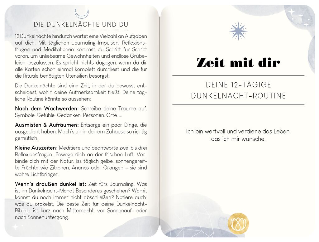 "Die 12 Dunkelnächte bieten eine Rückschau auf das vergangene Jahr. Sie laden dazu ein, Altes loszulassen und Platz für Neues zu schaffen. 25 praktische und aufklappbare Karten mit Ritualen, tiefgehenden Reflexionen und entspannenden Meditationen sind die ideale Begleitung auf dieser Reise zu sich selbst. Außerdem bieten die Karten jede Menge Infos und Wissenswertes rund um die Herkunft und Tradition der Dunkelnächte. In dem beiliegenden Notizbuch können außerdem eigene Ideen und Gedanken festgehalten werden. Die Dunkelnächte sind die ideale Einstimmung auf die magische Zeit der Rauhnächte.