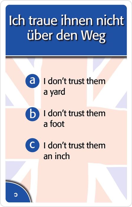 - Beschreibung "Oh dear!“ – wer bei schrägen Sprüchen gerne schmunzelt, liegt mit diesem Denglisch-Quiz goldrichtig. Ob beim Tee, im Pub oder auf der Couch: "Press on the tube!" bringt britischen Humor direkt an den Spieltisch. Über 75 lustige verdenglischte Redewendungen wollen geknackt werden – wer errät, was wirklich gemeint ist, und findet das passende englische Original? Manche Begriffe klingen englisch, gibt's aber nur bei uns – da raucht der Kopf und es wird ordentlich gelacht. Ein Ratespaß für alle, die Sprachwitz lieben und dabei ganz nebenbei ihr Englisch aufpolieren möchten.So läuft's ab:Reihum wird der denglische Spruch ins Deutsche übersetzt.Danach heißt es: Welches englische Original steckt dahinter?Jede richtige Antwort bringt einen Punkt.Wer die meisten Punkte sammelt, gewinnt. Easy!Inhalt:75 Karten5 AnleitungskartenText: Rolf Krzon, Georg SchumacherrDesign: Arnold Reisse