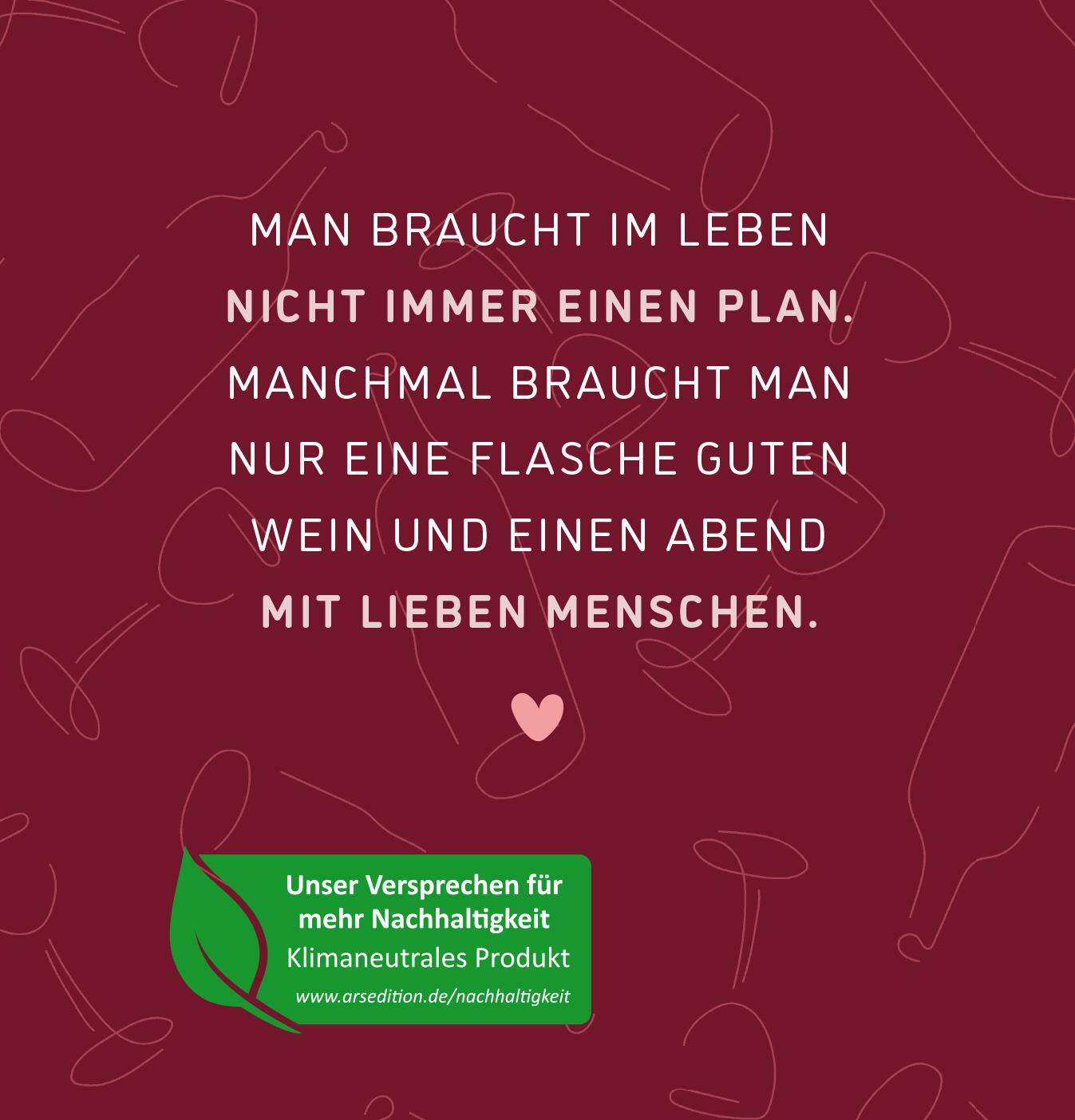 - Beschreibung Du hast keinen Plan? Egal, Hauptsache, es gibt Wein. Mit diesem trendigen Aufsteller sorgst du vor und nach dem Aperitif für gute Laune. Das Spiralbuch mit witzigen Sprüchen zu Vino, Cocktails & Dolce Vita bringt dich immer wieder zum Schmunzeln. Ein tolles Geschenk für alle, die Genuss und schwarzen Humor lieben – und dazu gern einen Rotwein trinken. Ein wunderbares Geschenk für Männer und Frauen, die Freundin oder den Kollegen und ein echter Hingucker für Küche, Schreibtisch und Wohnzimmer. Ideales Geschenk für alle, die gern entspannen: Witzige Quotes rund um die Themen Wein, Prosecco und das Leben an sich Moderne Gestaltung: Ein toller Hingucker in abwechslungsreichem Foto-Typo-Design Sich kleine Auszeiten im Alltag gönnen: Durch Spiralbindung ganz einfach immer wieder einen neuen lustigen Spruch aufstellen und sich freuen Trendiges Dekoelement: Ob Homeoffice, Büro, Wohnzimmerregal oder Küchentisch – dieses Spiralbuch macht sich überall gut Der Umwelt zuliebe: FSC-zertifiziertes Papier Die besten Sprüche für mehr Spaß am Arbeitsplatz oder zu Hause Gönn dir eine Pause! Diese lustigen Sprüche zum Thema schönes Leben, Kulinarisches und Entschleunigung fördern nachweislich die gute Laune und bauen Stress ab. Zum Aufstellen, Umblättern und Freuen!