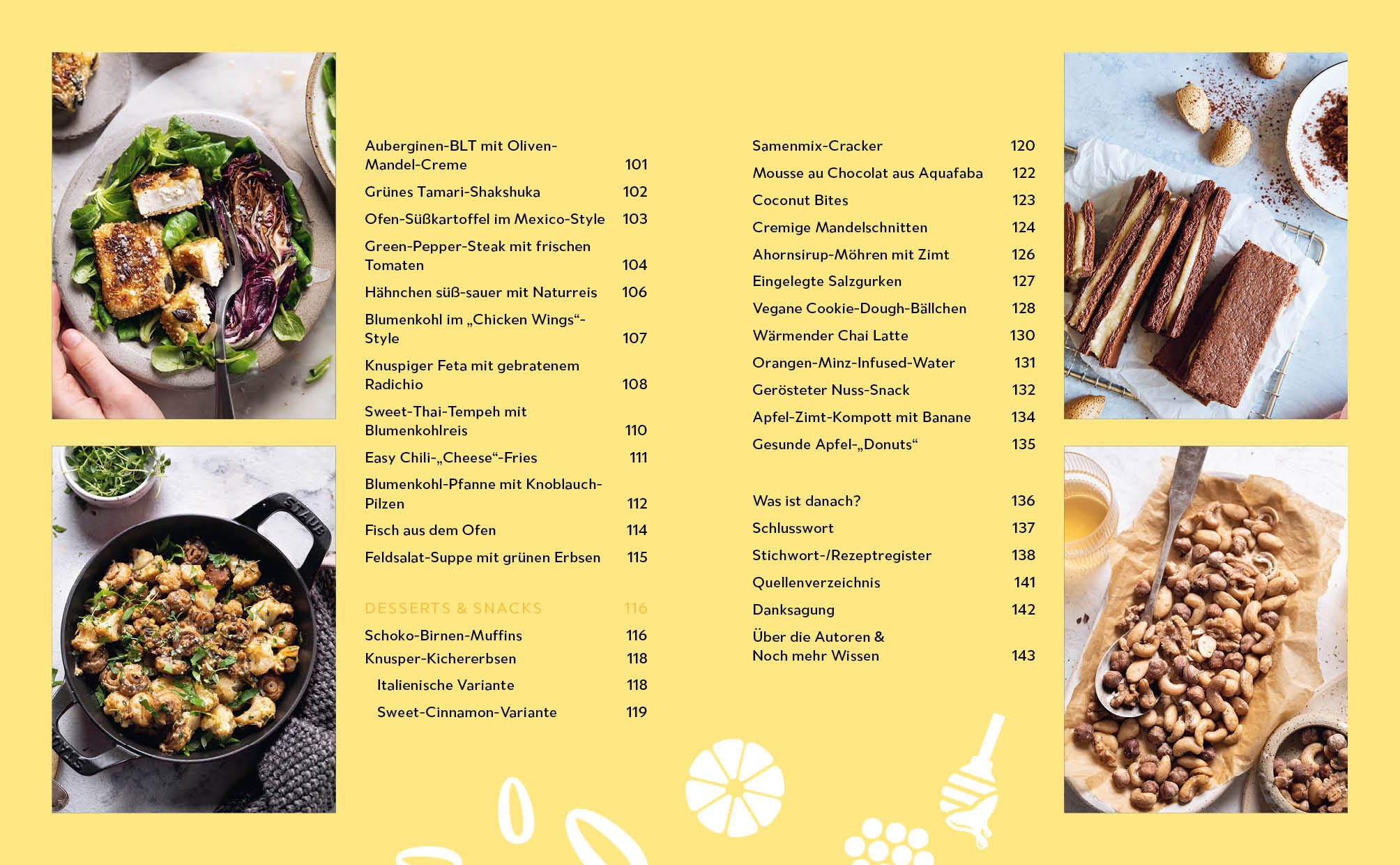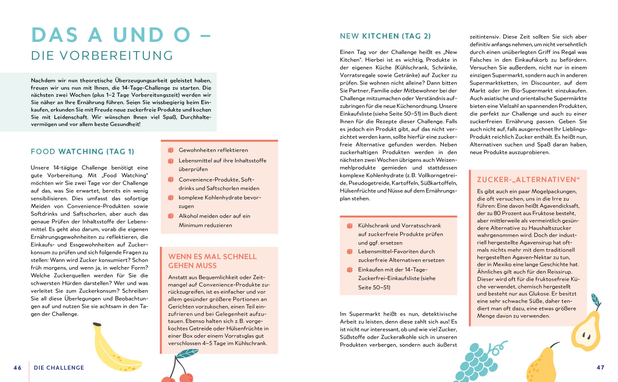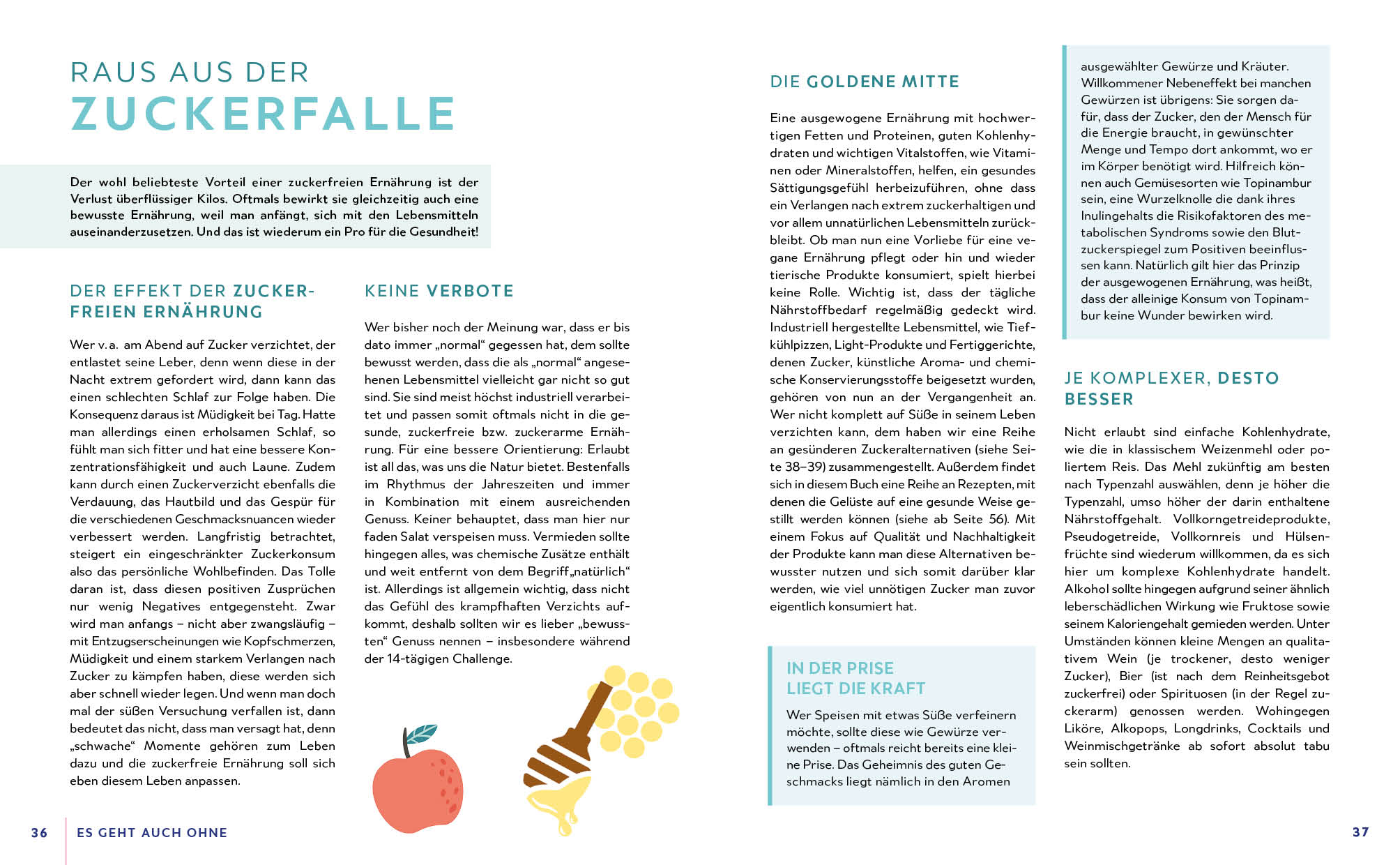Gesunder Verzicht muss dabei nicht langweilig sein. Dafür sprechen Köstlichkeiten wie Sweet-Thai-Thempeh oder Grünes Tamari-Shakshuka, die sich neben Süßigkeiten wie Mandelschnitten oder Coco-Bites reihen, ergänzt durch gesunde Zwischenmalzeiten, zu denen ein schmackhafter All-good-Greens-Smoothie oder eine Frozen Bowl gehören. Neben diesen fein abgestimmten Rezeptideen finden sich Tipps und Informationen zum Thema „Süßmacher und Co“. Durch das praktische Hintergrundwissen lernt man, versteckten Zucker in den Inhaltsstoffen zu erkennen und stattdessen geeignete Zuckeralternativen auf den Speiseplan zu setzen. So kommt man der zuckerfreien Ernährung schon einen guten Schritt näher. Denn eine zuckerfreie Ernährung im Alltag ist leichter als man denkt.