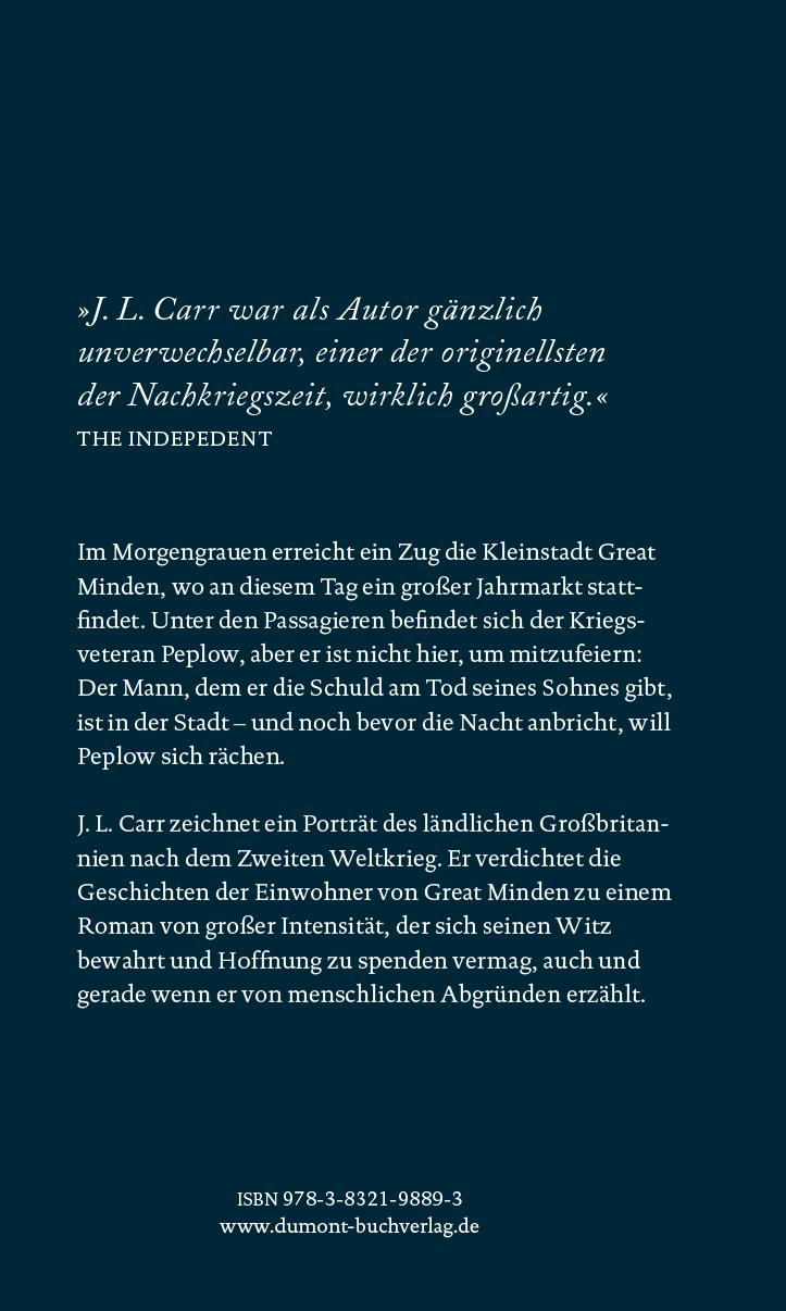 Die Menschen, die in Great Minden leben, leiden alle auf ihre Weise an der Welt – und doch findet Peplow hier im Angesicht seiner persönlichen Katastrophe neue Hoffnung. In seinem Debütroman zeichnet J. L. Carr ein Porträt des ländlichen Großbritannien und richtet den Blick auf eine Gruppe von Menschen, die nach Erlösung suchen. Er lässt die Erzählbewegung zwischen den Figuren dieser Stadt pendeln und verdichtet die einzelnen Stränge zu einem Roman von unvergleichlicher Intensität, der sich seinen Witz bewahrt, auch und gerade wenn er von menschlichen Abgründen erzählt.