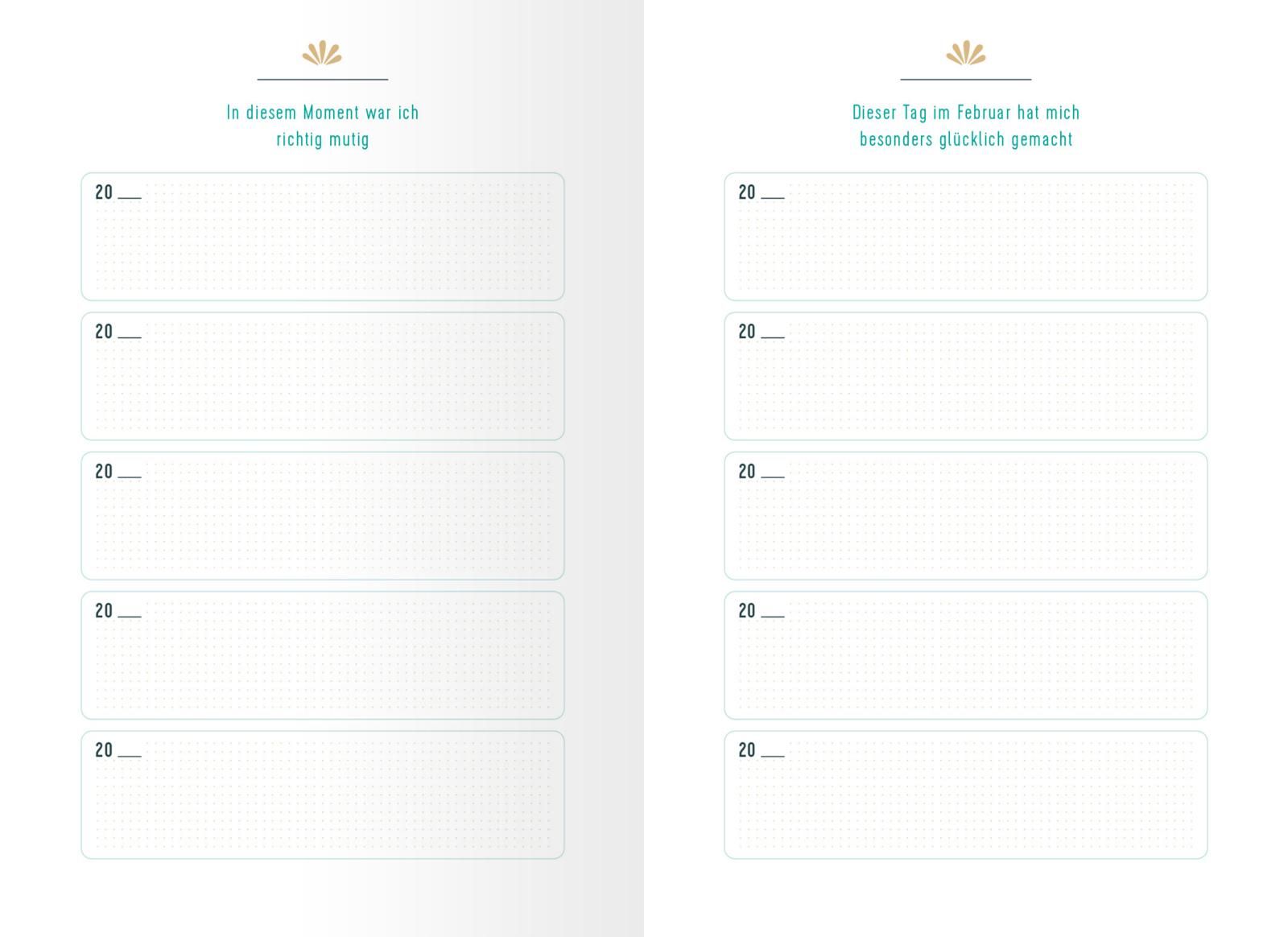 Lass in diesem geführten Frage-Tagebuch jeden Monat Revue passieren. Jahr für Jahr übersichtlich untereinander notiert, kannst du jederzeit zurückblättern und dich an die schönsten Momente erinnern.