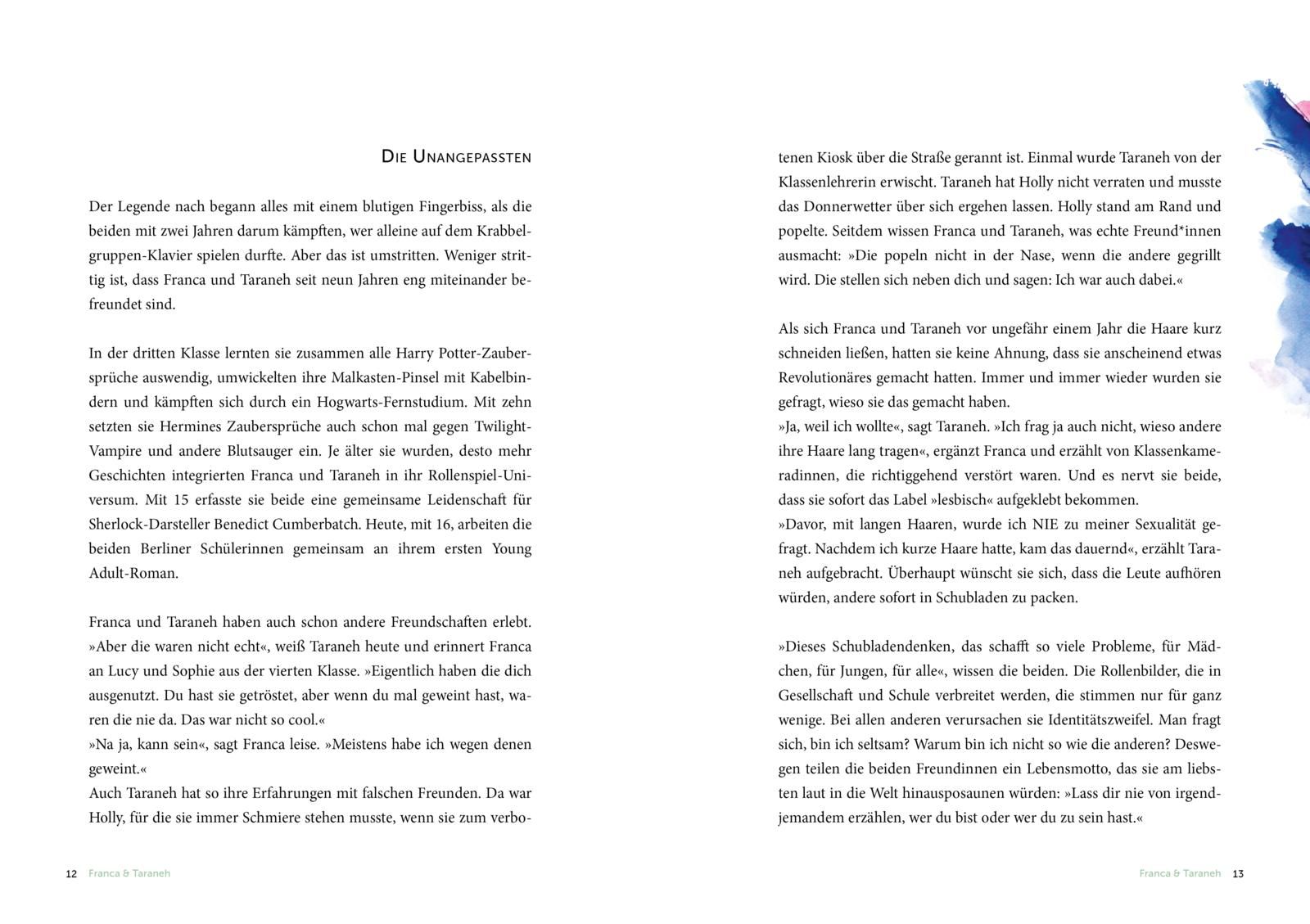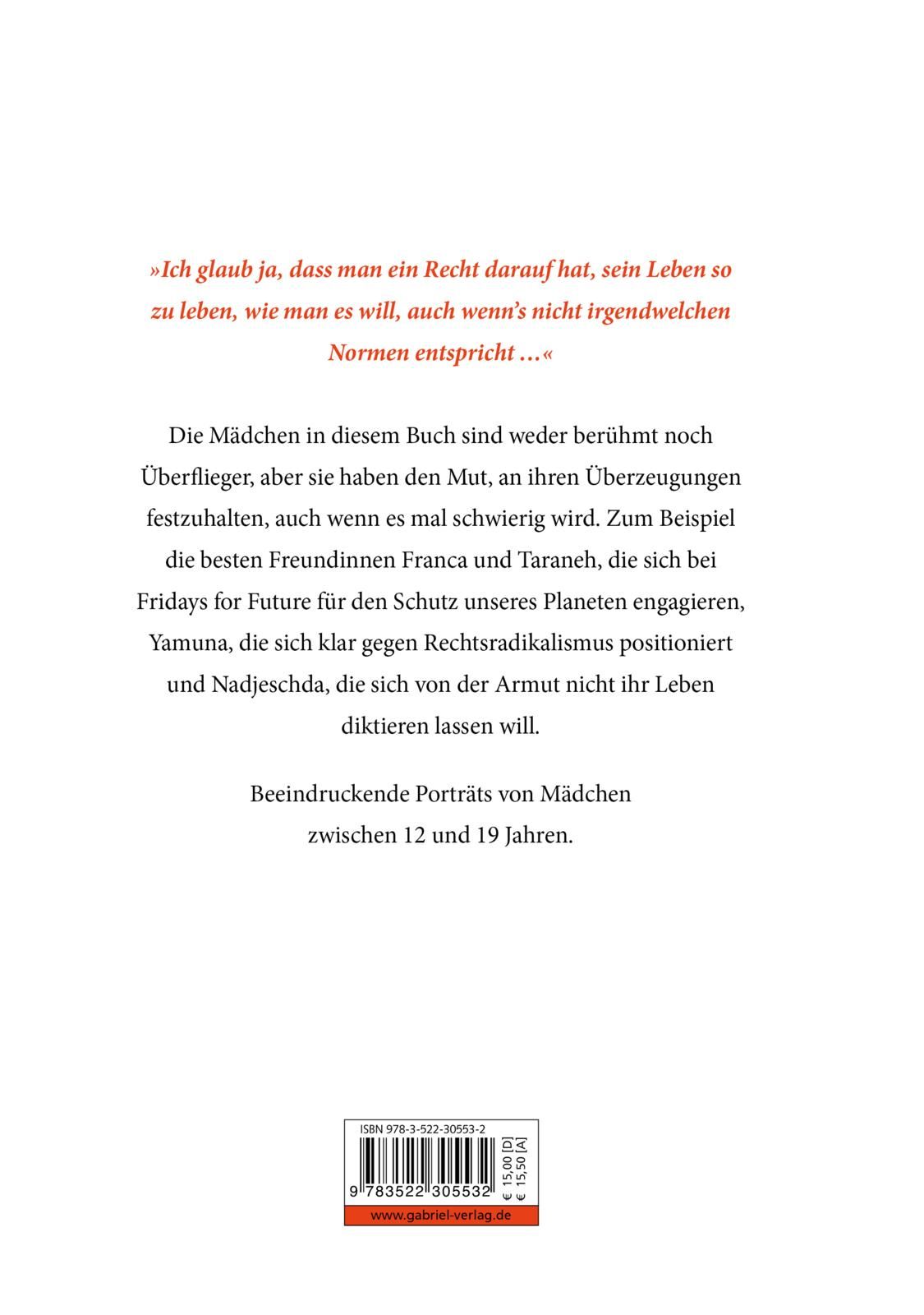 Wahre Geschichten von Mädchen aus Deutschland für Jugendliche ab 12 Jahren. Die Mädchen in diesem Buch sind weder berühmt noch Überflieger, aber sie haben den Mut, an ihren Überzeugungen festzuhalten, auch wenn es mal schwierig wird. Zum Beispiel die besten Freundinnen Franca und Taraneh, die sich bei Fridays for Future für den Schutz unseres Planeten engagieren, Yamuna, die sich klar gegen Rechtsradikalismus positioniert und Nadjeschda, die sich von der Armut nicht ihr Leben diktieren lassen will.